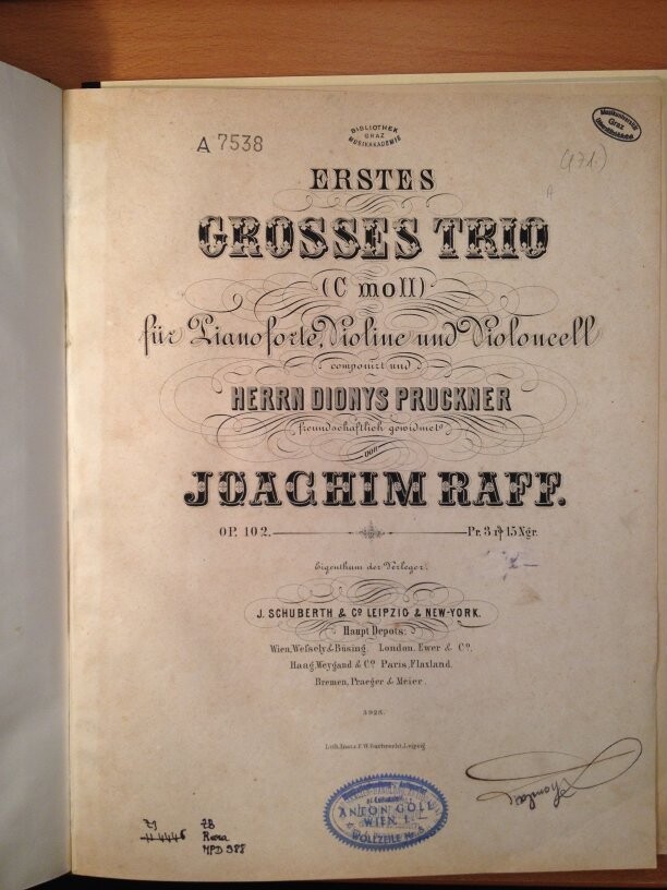 Erstes grosses Trio (c-Moll) für Pianoforte, Violine und Violoncell : op. 102 / Joachim Raff. - Spielpart. und Stimmen - Leipzig [u.a.] : Schuberth, [1864]. - 51 S. + 2 St.